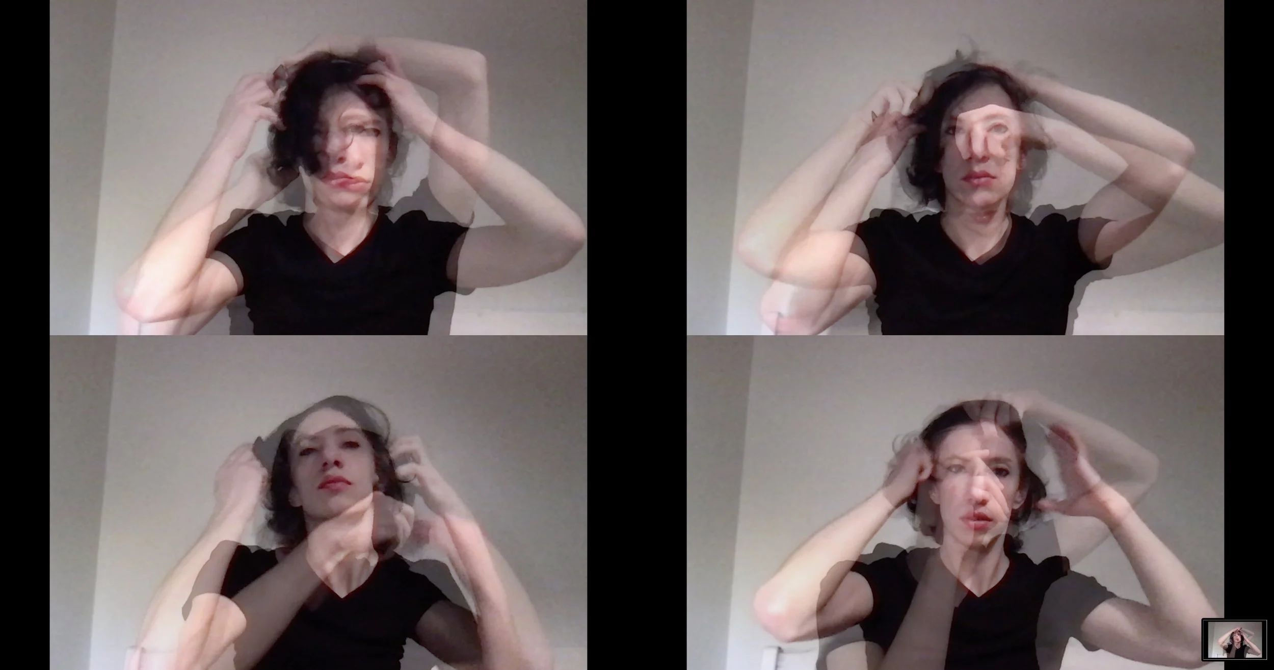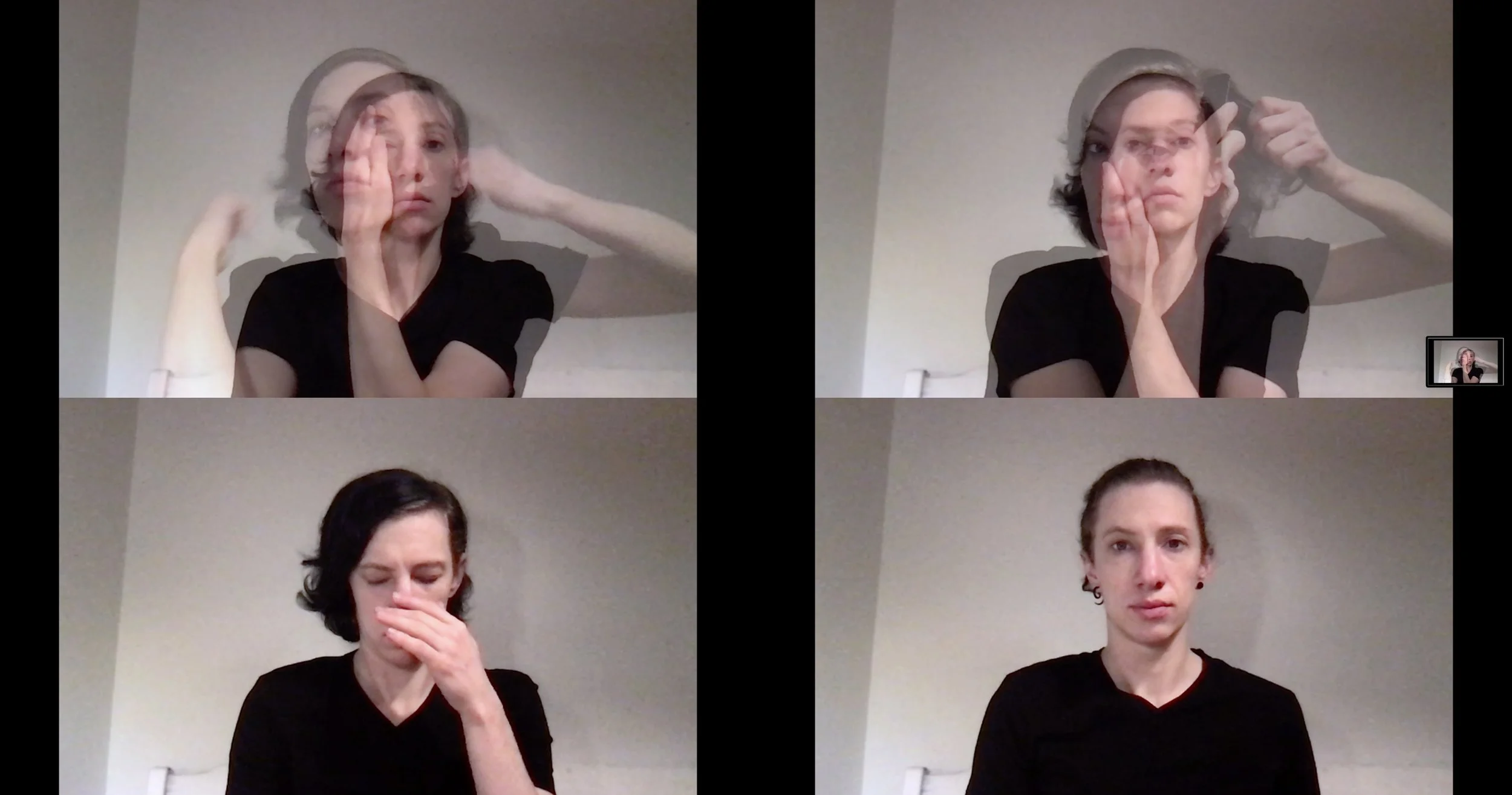 Performanssissa teen sukupuolta merkitseviä pieniä tekoja videopuhelusovelluksessa ihmisestä näkyvän kehyksen (kasvot ja osa ylävartaloa) mittakaavassa.